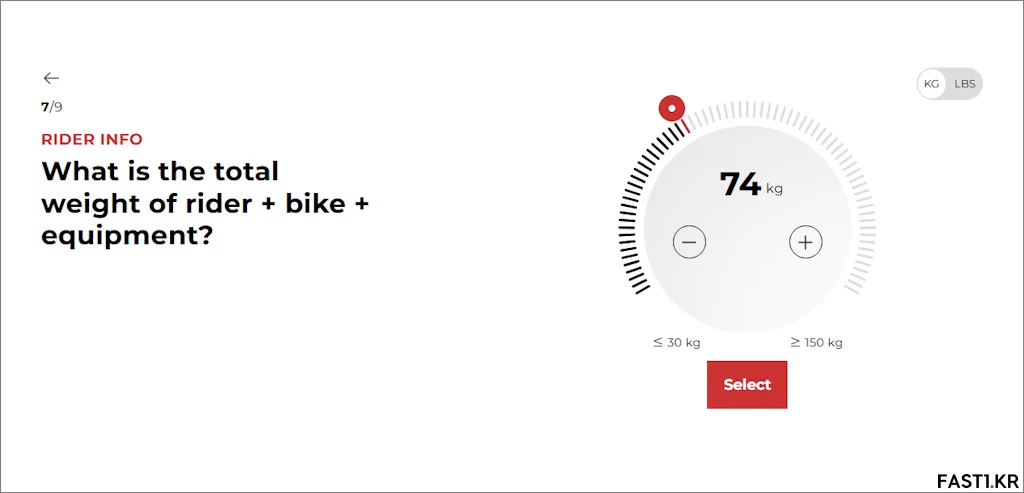 다음으로 라이더와 자전거 그리고 모든 장비가 합쳐진 무게를 선택합니다.