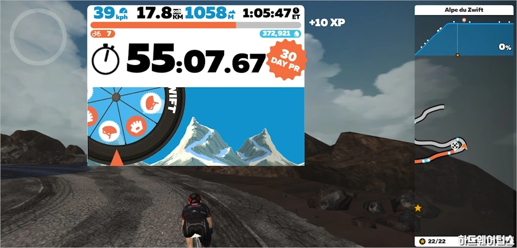 다만, 업힐이 메인인 코스 Alpe du Zwift나 Ven Top 같은 코스를 타는 경우 (Alpe du Zwift는 추가로 업힐 완료 후 보상 룰렛이 존재), 바로 종료하지 않고 조금 더 주행해서 페달을 놓아도 자동으로 내려오는 긴 다운힐까지 해주면 거리 증가에 따른 추가 경험치를 얻을 수 있습니다. (기본 XP + 다운힐 XP + 보상 룰렛)