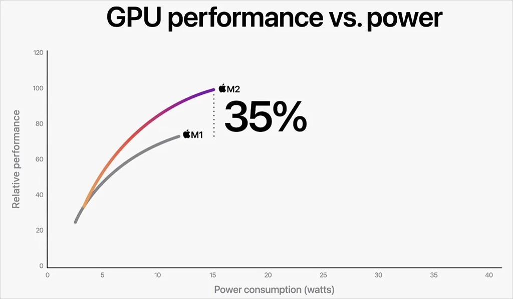 또한, 애플은 M2가 인텔 코어 i7-1255U의 통합 GPU와 비교할 경우 같은 소비 전력에서 2.3배 높은 성능, 5분의 1의 소비 전력으로 동급의 성능을 제공한다고 밝혔습니다.