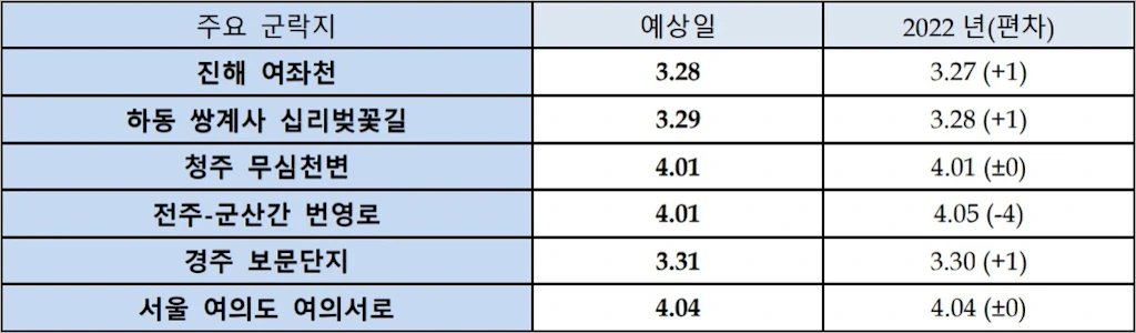 2023년 주요 군락지 벚꽃 개화 시기 (날짜 순서 정렬)