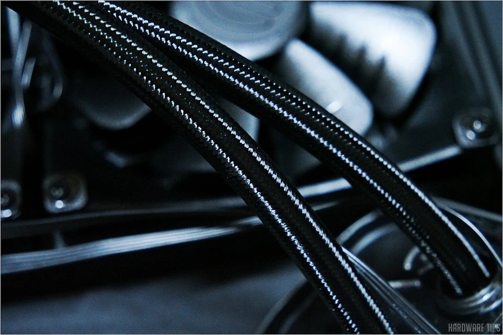 직조 슬리빙 처리된 유광 블랙 튜브. 대부분의 일체형 쿨러들과 마찬가지로 약간 뻣뻣한 느낌입니다.