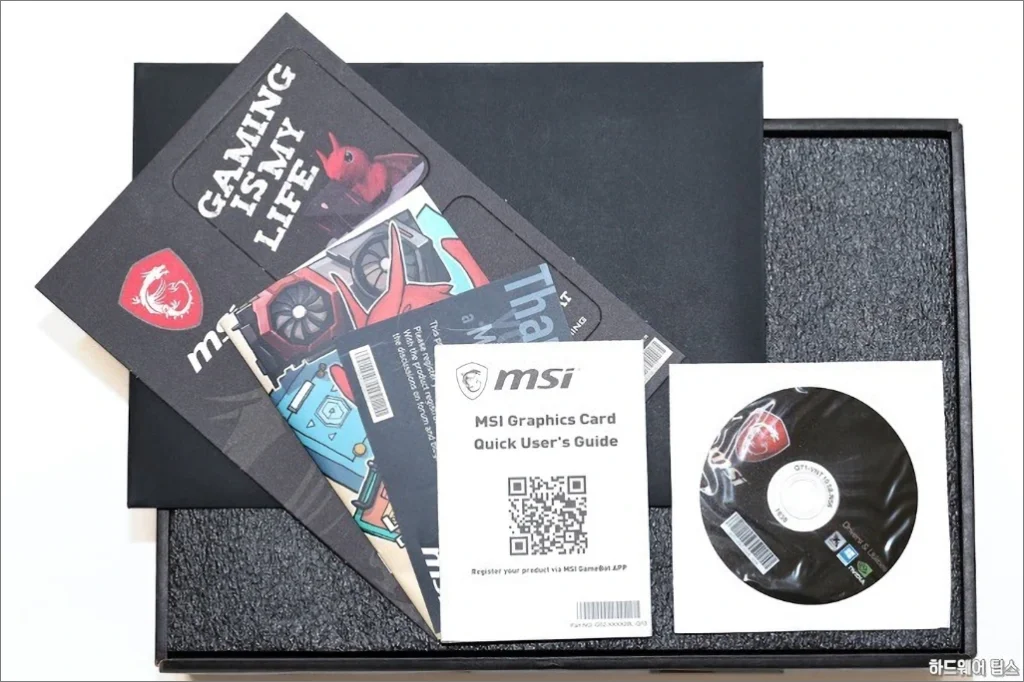 액세서리 박스에는 설명서, 카드, 드라이버 DVD, 컵받침 등이 들어 있습니다.