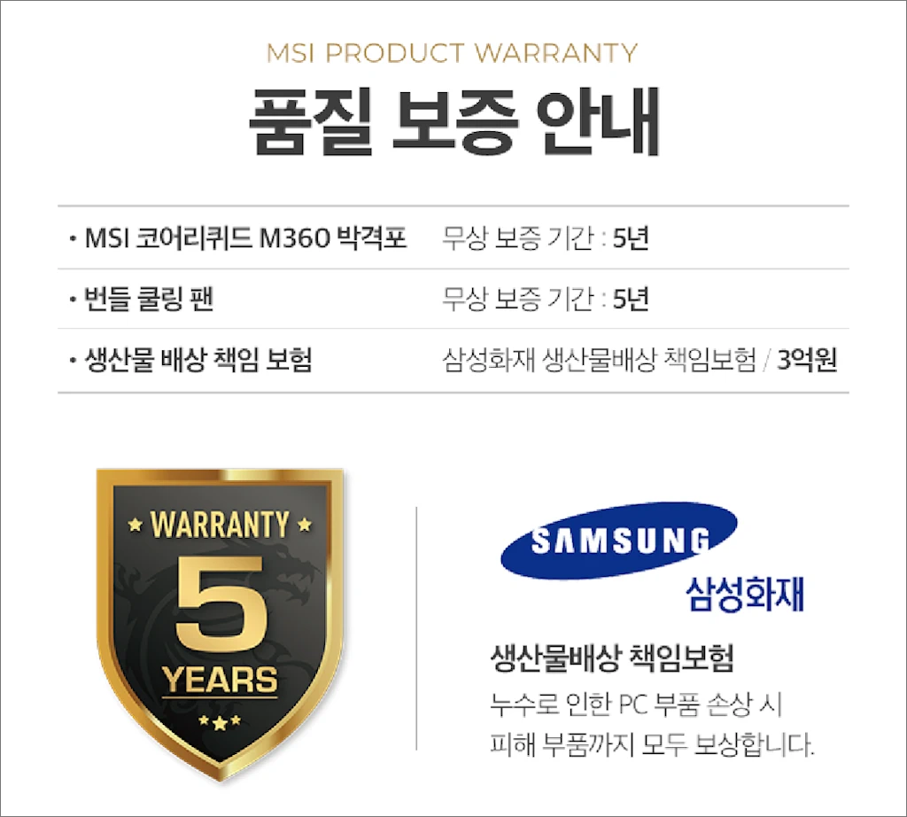 MAG 코어리퀴드 M360 박격포는 가장 중요한 쿨링 성능과 소음 특성이 우수한 편이며, 설치나 사용 중 크게 신경 쓰일 정도의 불편함이나 단점을 느낄 수 없었습니다. 또한 기존 보급형 포지션이었던 전작 코어리퀴드 R 시리즈의 짧은 무상 서비스 기간 또한 5년으로 확대되어 보다 안심하고 사용할 수 있습니다.