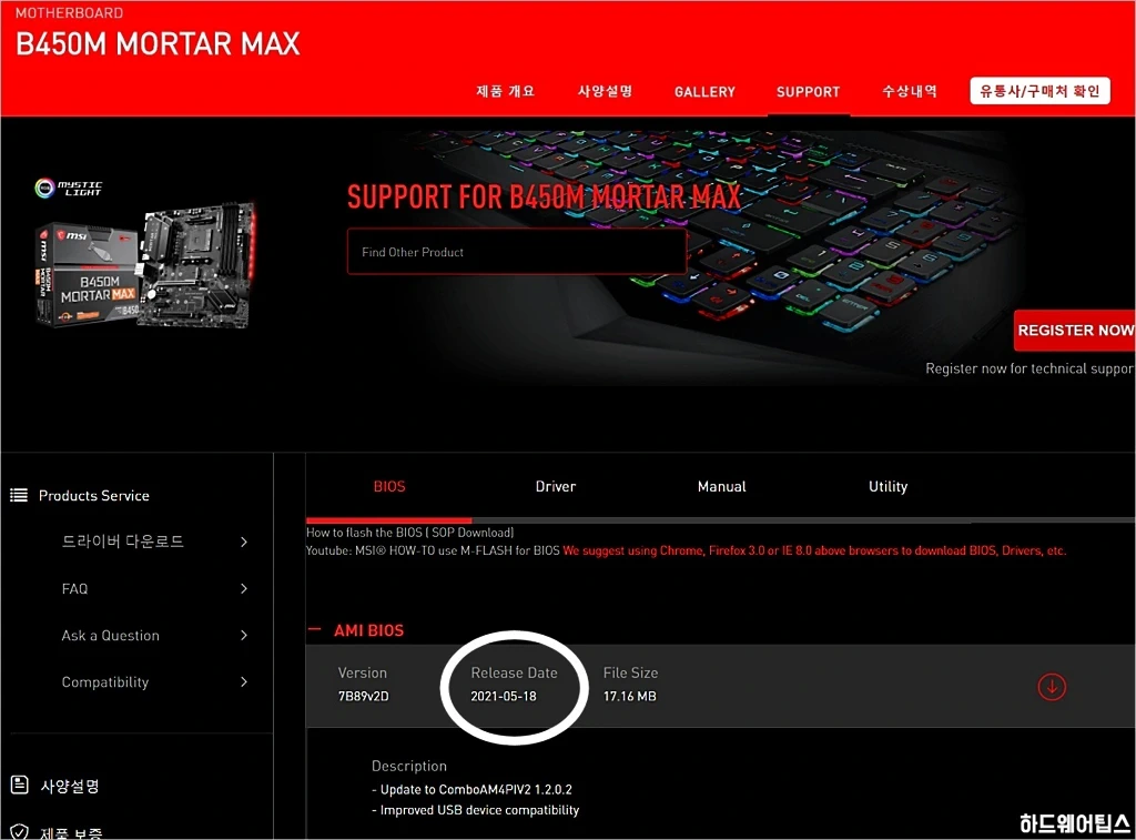 사용기 작성일 기준 최신 BIOS는 2021년 5월 18일 버전이 등록되어 있습니다.