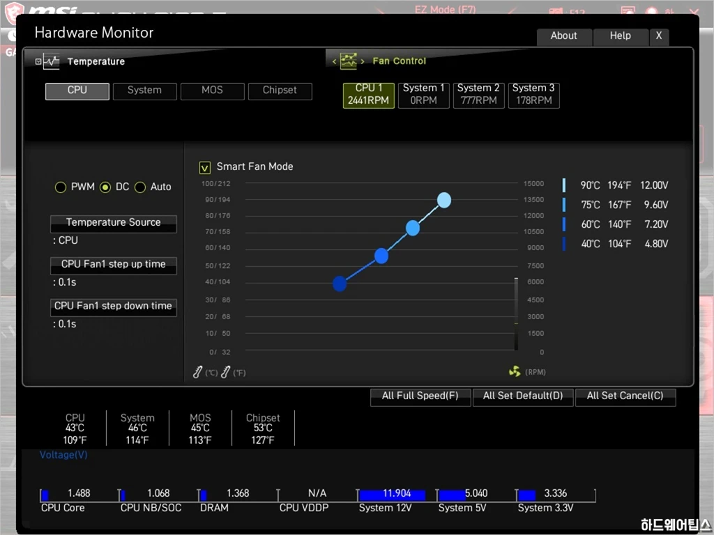 하드웨어 모니터 탭에서는 시스템을 모니터링하고 팬 스피드를 상세하게 설정할 수 있습니다.