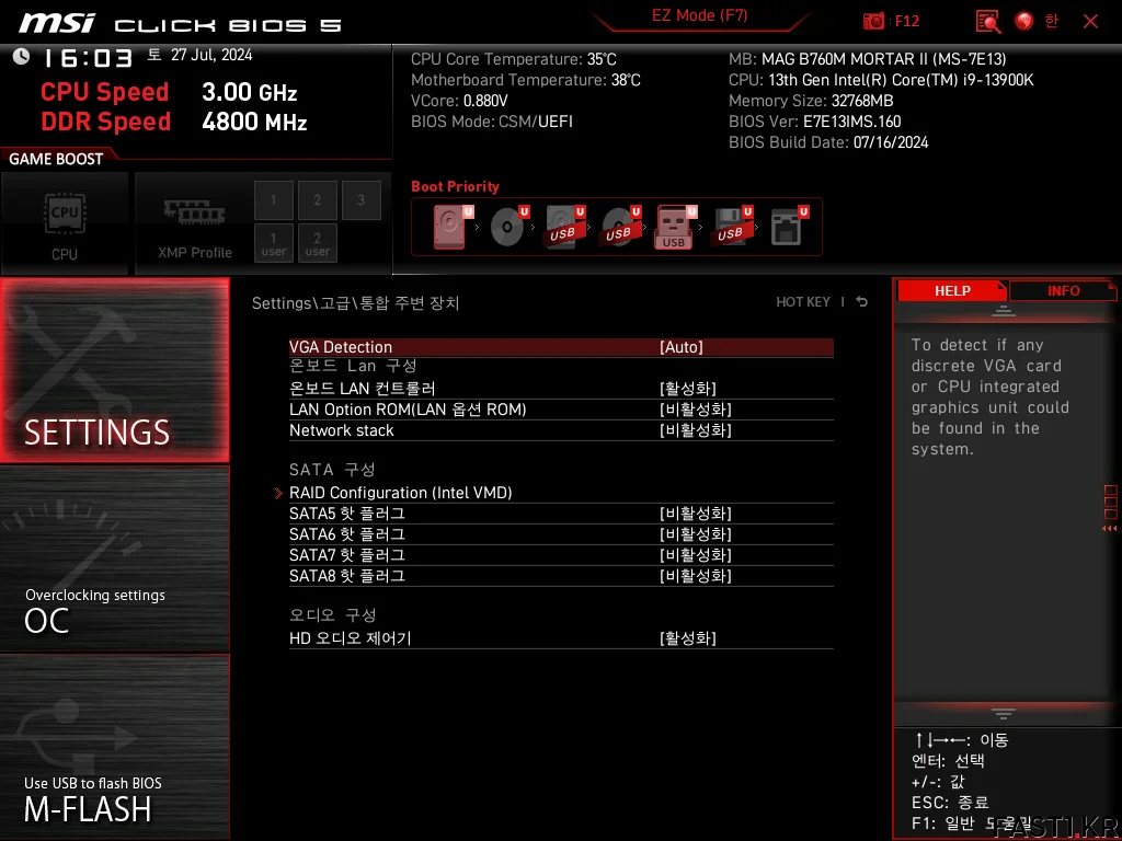이 메뉴에서는 그래픽 기능 우선 순위, 통합 그래픽 공유 메모리 크기, 외장 그래픽 카드와 통합 그래픽 동시 사용 유무 등의 기능을 설정할 수 있습니다. MAG B760M 박격포 II는 디스플레이포트 및 HDMI 포트를 모두 내장해 최대 4K@60Hz 해상도까지 출력이 가능합니다.