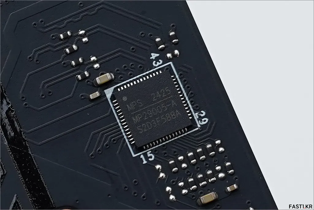 전원부는 60A급 스마트 파워 스테이지인 Monolithic Power Systems (MPS) MP87661, 알루미늄 솔리드 커패시터, SMD 몰딩 (표면실장형) 파워 인덕터로 구성되어 있으며, MAG Z890 토마호크 WIFI와 동일한 Monolithic Power Systems (MPS) MP29005-A 디지털 PWM 컨트롤러로 제어됩니다.