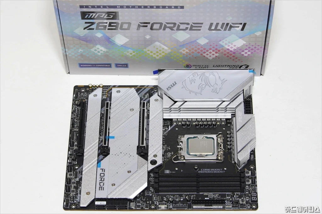외형적인 부분부터 살펴보면 MPG Z690 FORCE WIFI는 화이트, 실버 컨셉으로 전작 대비 크게 변경되었습니다. MSI에서는 MAG에서 타이태니엄(티타늄) 모델로 화이트/실버 시장을 공략했었는데, 아마 경쟁사의 ROG STRIX, PRIME-A나 비전 같은 보다 고가의 제품에 대응하기 위한 것으로 생각됩니다.