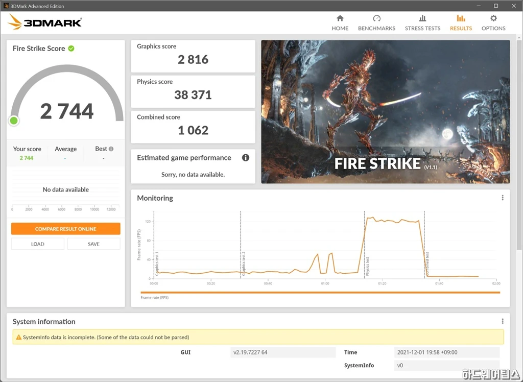 파이어 스트라이크 기준 약 2744점으로 측정됐네요.