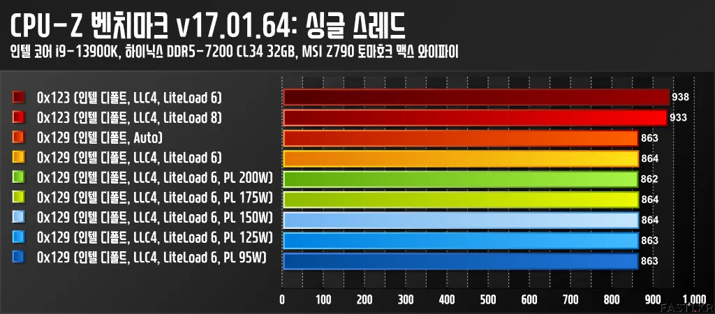 기존에는 아무리 못해도 900점대, 예전에 오버클러킹 테스트를 할 때는 1,000점도 넘었던 13900K인데, 0x129 기반 바이오스에서는 싱글 점수가 860점대로 내려 앉았습니다.